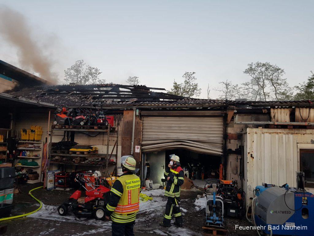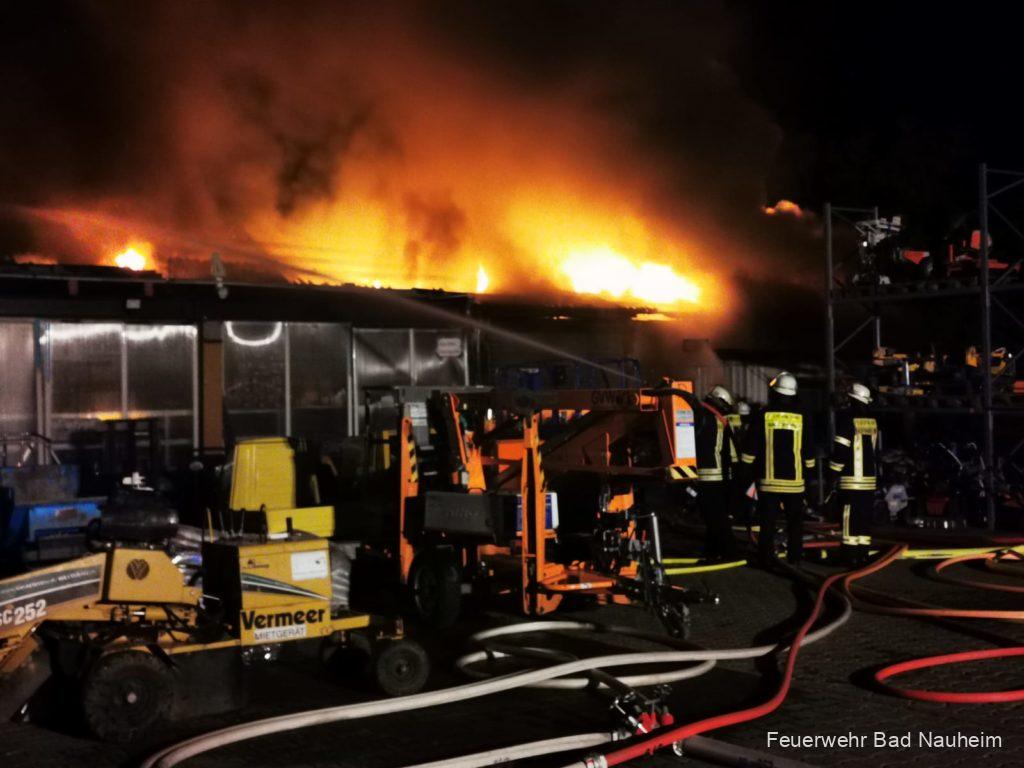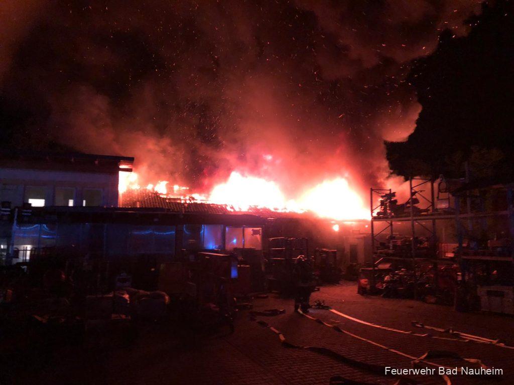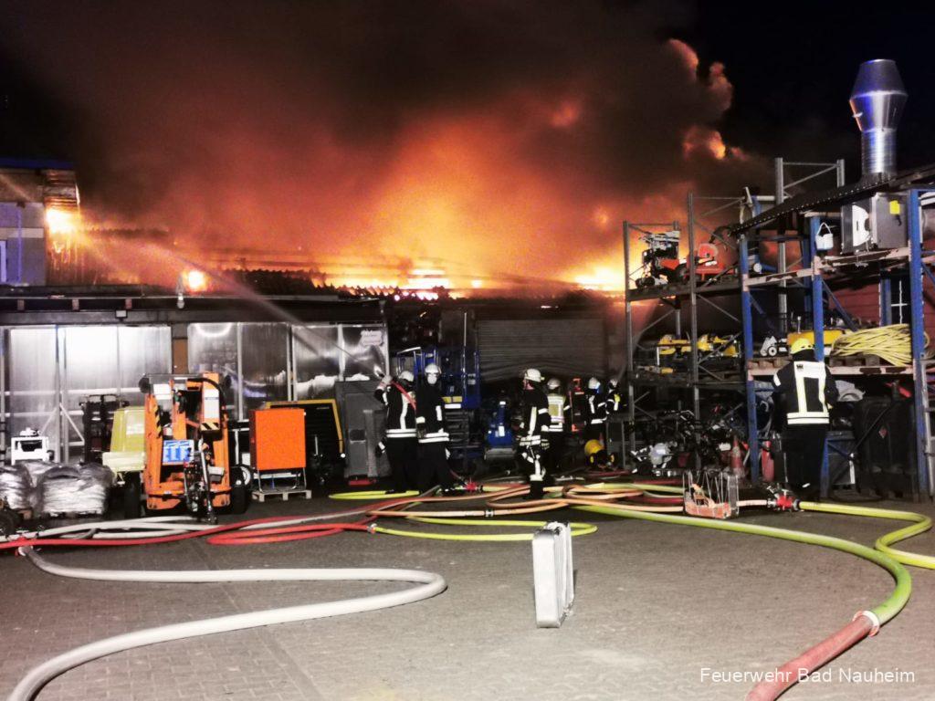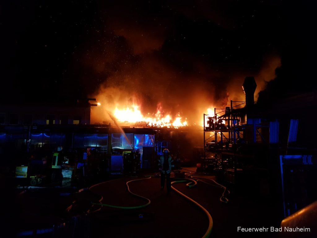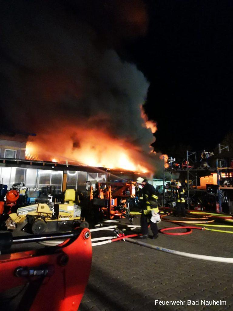 Der auf der Anfahrt zum Stützpunkt befindliche Stadtbrandinspektor Wolfgang Löffler kam an der Einsatzstelle vorbei und konnte eine erste qualifizierte Lagemeldung abgeben und veranlasste daraufhin eine umfangreiche Alarmierung von weiteren Einsatzkräften. Es zeigte sich nämlich bei der ersten Lageerkundung, dass eine Lagerhalle für Maschinen sowie der Dachstuhl eines daran angrenzenden Bürotraktes brannte. Letztendlich wurde für alle Abteilungen der Freiwilligen Feuerwehr Bad Nauheim Alarm ausgelöst.