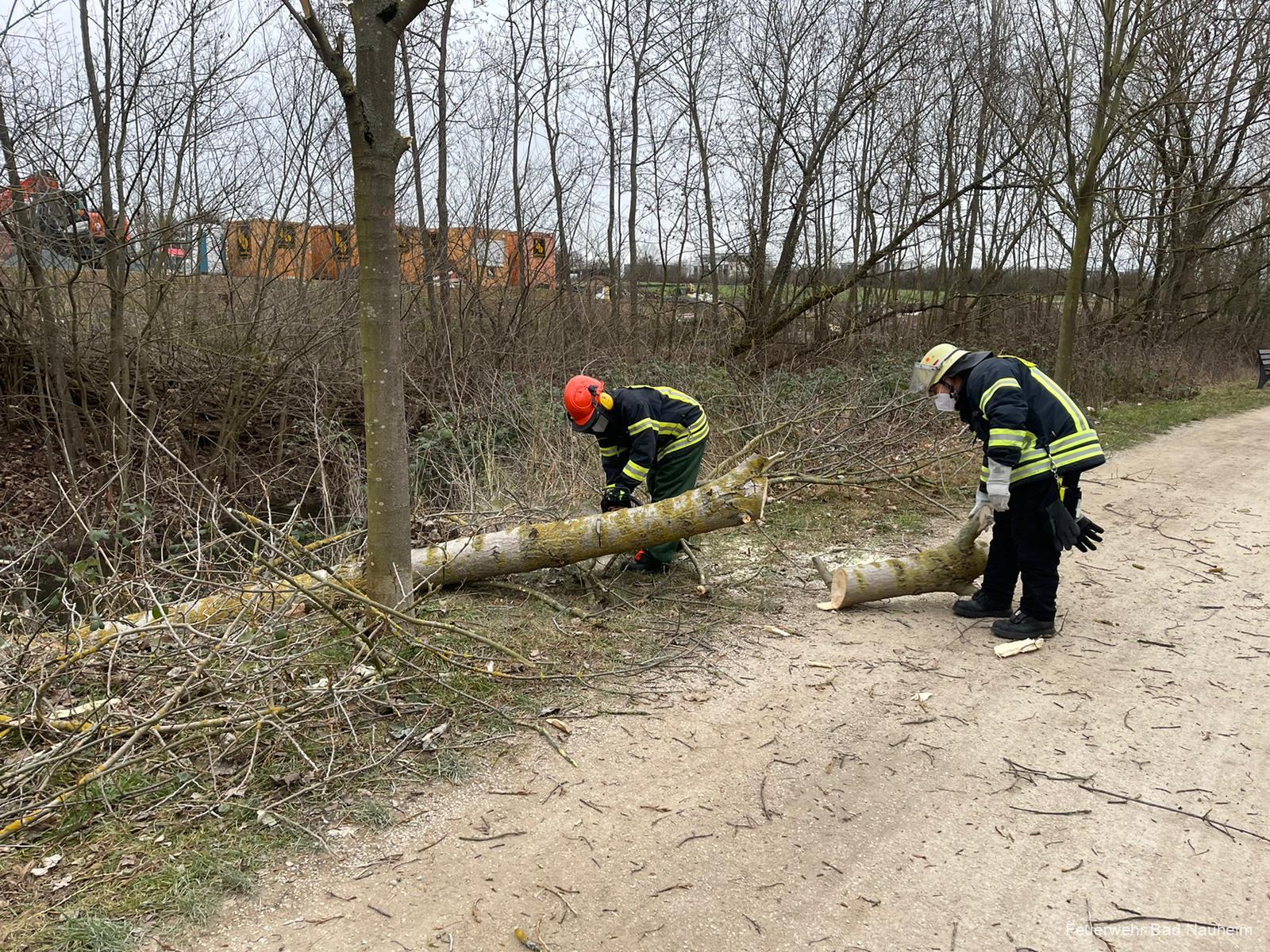 Unter den Augen einiger Schaulustiger wurde zuerst die Baumkrone entastet, anschließend wurde der Baum gefällt. Nach dem Freischneiden des Fußwegs war der Einsatz für die Feuerwehr beendet.