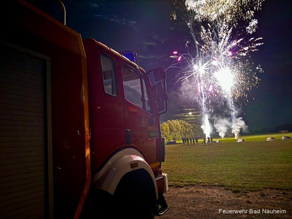 Doch der Tag war noch nicht zu Ende: Um 21:45 Uhr trafen sich die Kameraden erneut, diesmal um das Feuerwerk zum Abschluss des Rosenfestes abzusichern. Mit 5 Fahrzeugen und 20 Kräften fuhren sie in Steinfurth am Festzelt vor. Das zehnminütige Feuerwerk war gegen 23:15 Uhr beendet und damit auch das 48. Steinfurther Rosenfest. Gegen 0 Uhr war dann auch dieser Dienst vorüber und die ehrenamtlichen Helfer konnten in ihren wohlverdienten Feierabend gehen.