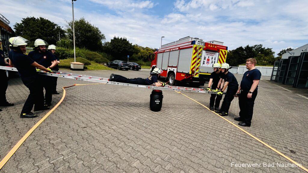 Die Mannschaft auf dem Stützpunkt begann den Tag mit einem gemeinsamen Frühstück und kümmerte sich im Anschluss um einige Arbeiten im Feuerwehrstützpunkt. Die Fahrzeughalle wurde gereinigt, ein Zwischenboden abgebaut, das Lager ausgemistet und ausgeräumt sowie Fahrzeuge geputzt. Im Laufe des Tages galt es dann noch, feuerwehrtechnische Knobelaufgaben und Geschicklichkeitsspiele zu lösen. Auch im restlichen Stadtgebiet gab es keine Einsätze für die Kameraden, sodass nicht ausgerückt werden musste. Gegen 17 Uhr kehrten die Kollegen aus Steinfurth zurück und der Dienst wurde mit einem gemeinsamen Grillen beendet.