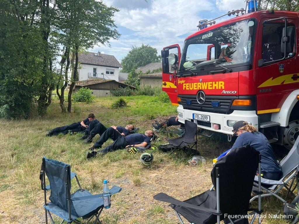 Bereits um 07:30 Uhr traten die 30 Kameraden am Sonntag auf dem Hof des Stützpunktes an. Nach kurzer Unterweisung und Einteilung rückten der Einsatzleitwagen sowie zwei Löschfahrzeuge nach Steinfurth ab und bezogen ihre Positionen. Dort verbrachten Sie den gesamten Tag bei hohen Temperaturen und standen bereit, sollte es in Steinfurth zu Einsätzen für die Feuerwehr kommen. Dies war glücklicherweise nicht der Fall.