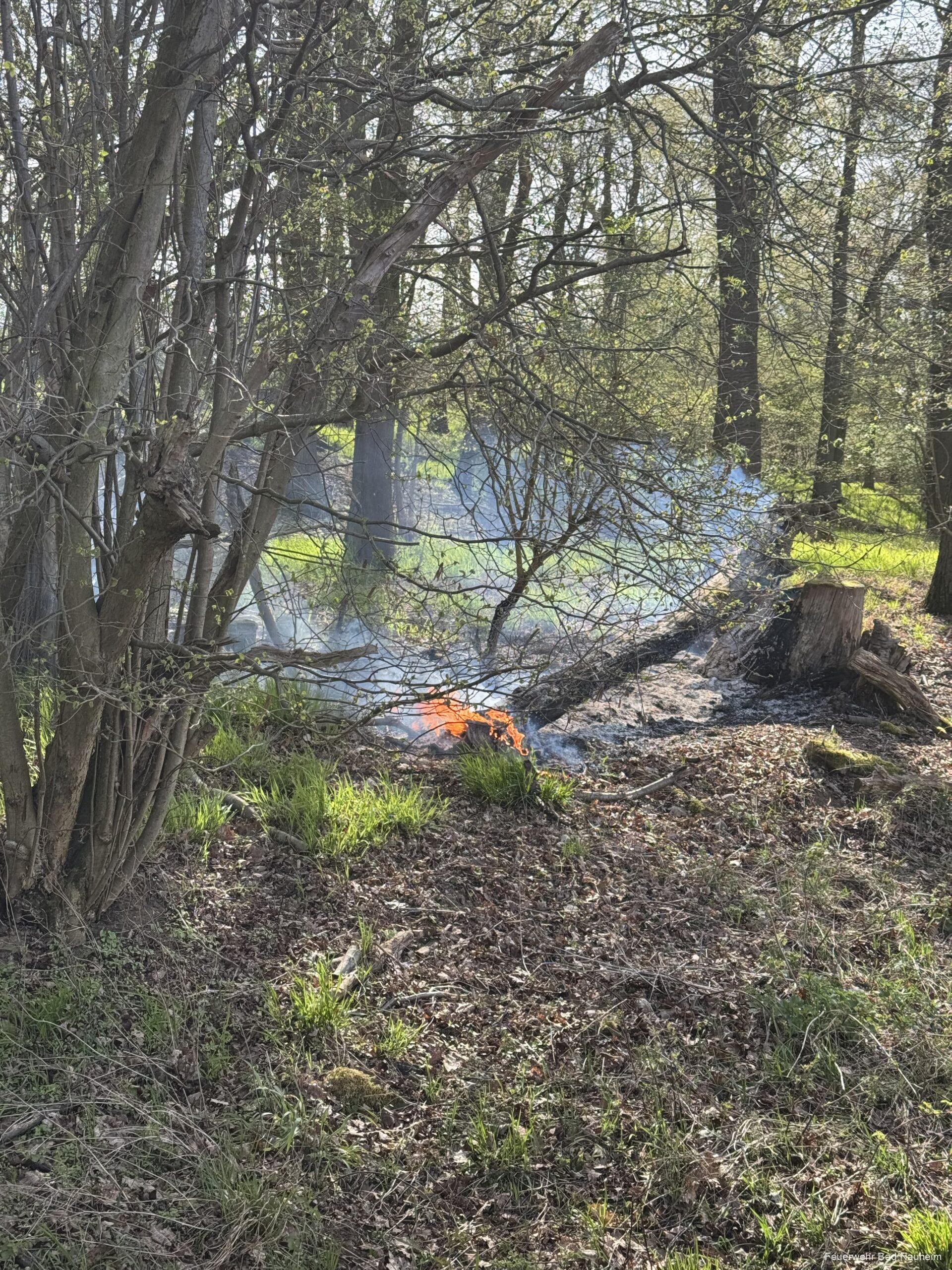 Sechs Einsatzkräfte rückten mit dem Löschfahrzeug aus, weitere Kräfte standen am Gerätehaus Steinfurth in Bereitschaft. An der Einsatzstelle brannten ca. 20 Quadratmeter Waldboden sowie ein Baumstamm und der dazugehörige Baumstumpf. Mit einem Rohr wurde der Brand abgelöscht, zusätzlich wurde der Stamm mit der Kettensäge geöffnet, um an Glutnester heranzukommen.