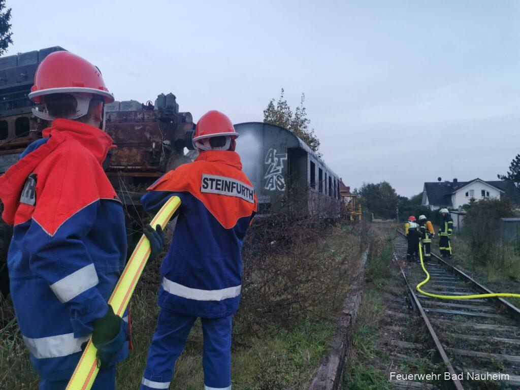 Marcel Jäger organisierte mit seinem Betreuerteam eine Übung im Brückgartenweg / Steinfurther Bahnhof. Ein Personenwagon der Eisenbahnfreunde hat (imaginär) Feuer gefangen und die Jugendfeuerwehr konnte – gemeinsam mit Helfern der Einsatzabteilung – ihr Können unter Beweis stellen. Jugendfeuerwehr und Einsatzabteilung arbeiteten Hand in Hand und konnten gemeinsam schnell das Szenario abarbeiten. Natürlich kam neben dem Lerneffekt auch der Spaß hierbei nicht zu kurz.