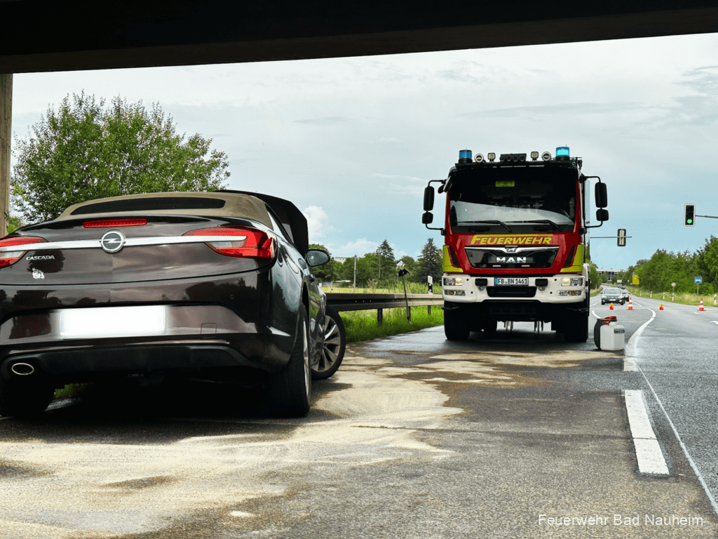 Noch während sich die Kameraden aus Nieder-Mörlen auf der Anfahrt zu der überschwemmten Tiefgarage befanden, alarmierte es erneut an diesem Wochenende für die Kameraden der Kernstadt. Nach einem Verkehrsunfall mit drei Fahrzeugen auf der B3 in Höhe der Abfahrt Bad Nauheim Süd liefen Betriebsmittel aus. Ein Löschfahrzeug rückte aus, sicherte die Einsatzstelle ab und nahm das auslaufende Öl auf. Weiterhin wurde die Straße von umherliegenden Teilen gereinigt. Eine Frau wurde bei dem Unfall verletzt, sie wurde durch den Rettungsdienst versorgt und in ein Krankenhaus gebracht. Die weiteren Arbeiten übernahmen Abschleppunternehmen sowie Hessen Mobil.