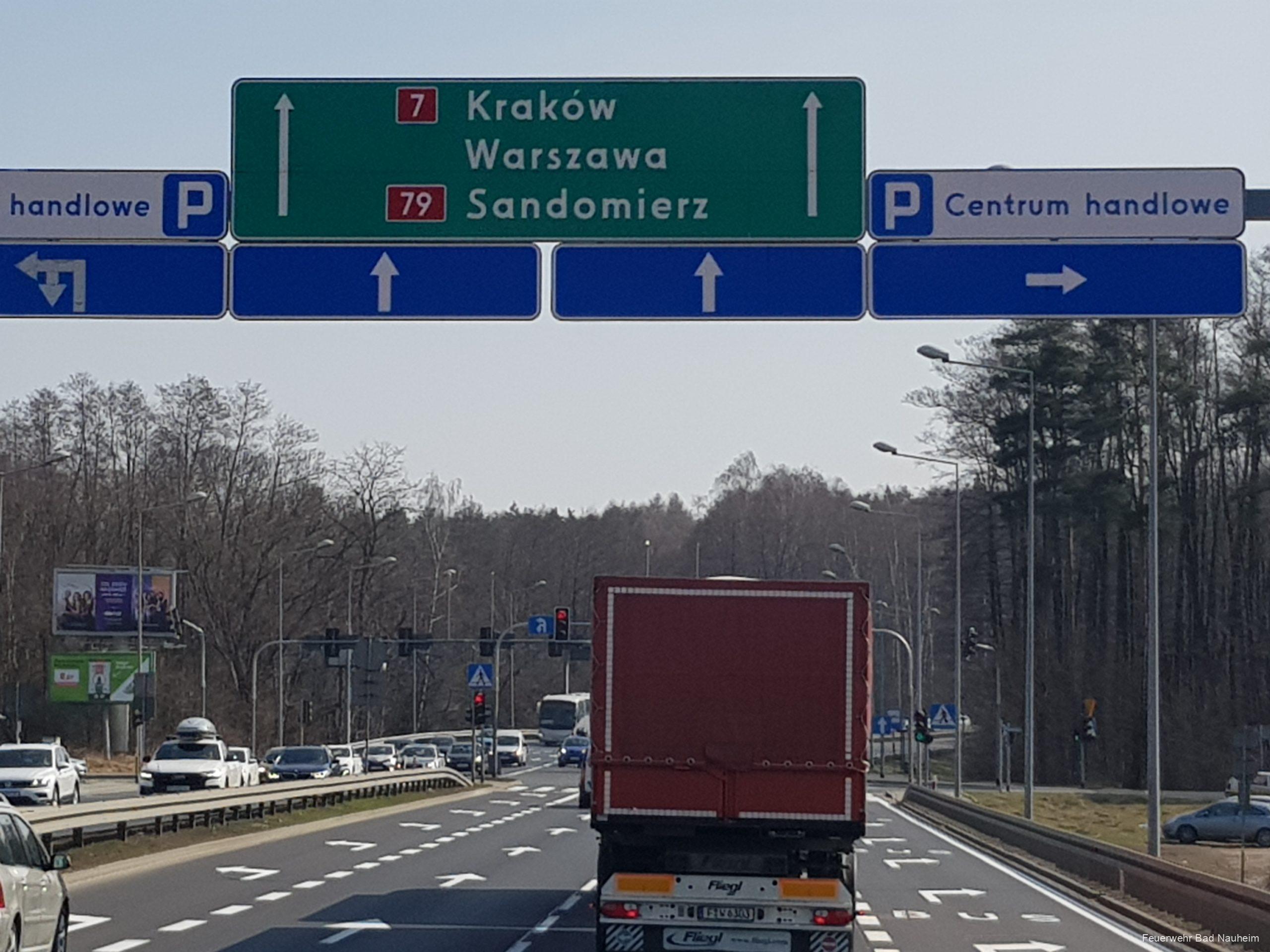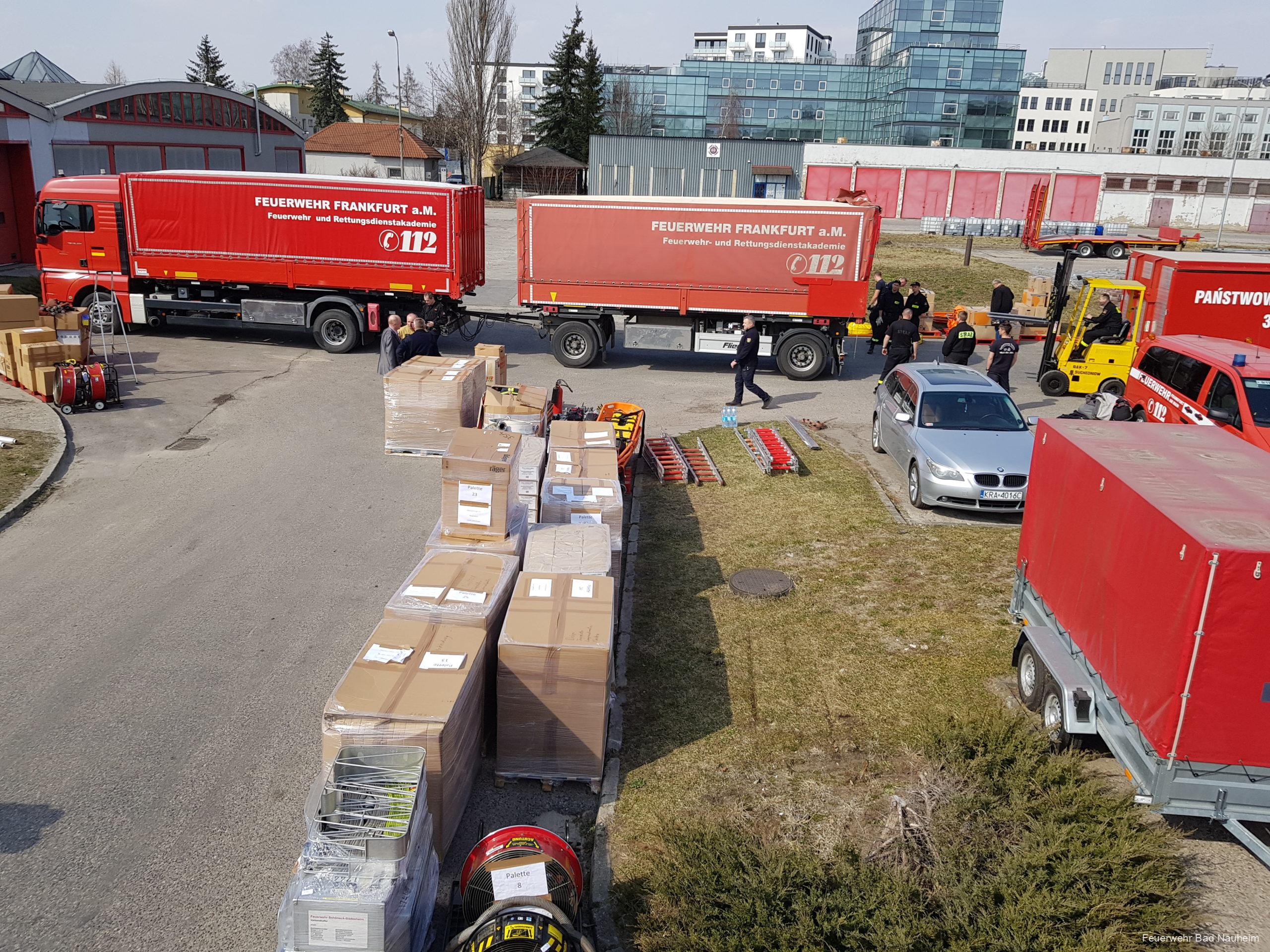 Nachdem sich die Beteiligten am Katastrophenschutzlager in Frankfurt getroffen und organisiert hatten, setzte sich der Zug bestehend aus einem Sattelzug und einem Begleitfahrzeug der Berufsfeuerwehr Frankfurt sowie unserem ehemaligen Löschfahrzeug um 21:40 Uhr in Bewegung. Die achtköpfige Mannschaft erreichte um 04:33 Uhr am Samstagmorgen die Grenze zu Polen und nach etwa 14 Stunden Fahrtzeit traf man um 11 Uhr in Krakau ein. Die Feuerwache 5 der Berufsfeuerwehr Krakau dient als Zwischenlager für Hilfsgüter und Spenden in die Ukraine, dort wurde auch das Material aus Deutschland aus- und für den Weitertransport umgeladen.