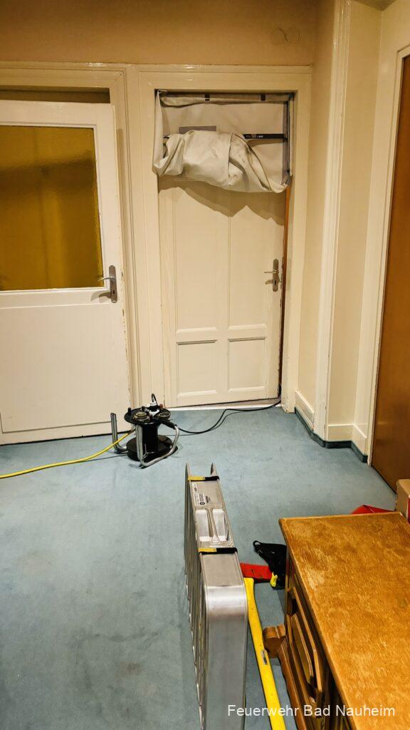 Ein Trupp ging unter Atemschutz in das 2. Obergeschoss vor und setzte einen Rauchvorhang in die Tür des betroffenen Gästezimmers, um die Ausbreitung des Rauches in Flur und Treppenraum zu verhindern. Danach betraten sie das Zimmer und fanden die Überreste eines schmorenden Föhns im Waschbecken des Badezimmers vor. Dieser wurde mit Wasser aus dem Wasserhahn abgelöscht. Ein weiterer Trupp kontrollierte zur Sicherheit die restlichen Räumlichkeiten, konnte aber weder Personen noch Ausbreitungen des Brandes feststellen.