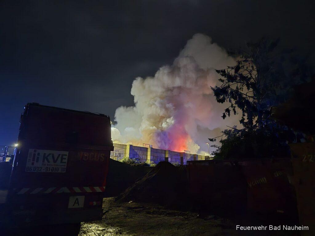 In der vergangenen Montagnacht brach gegen 23:50 Uhr ein Feuer auf dem Gelände eines Entsorgungsbetriebs in der Feldbergstraße aus. Autofahrer meldeten der Leitstelle Wetterau einen Feuerschein, der von der B3 aus sichtbar war. Erst als Kleinbrand eingestuft, wurde das Stichwort aufgrund weiterer Notrufe noch während der Anfahrt der ersten Einsatzkräfte aus der Kernstadt auf F2 – Mittelbrand erhöht und somit weitere Kräfte aus Nieder-Mörlen angefordert.