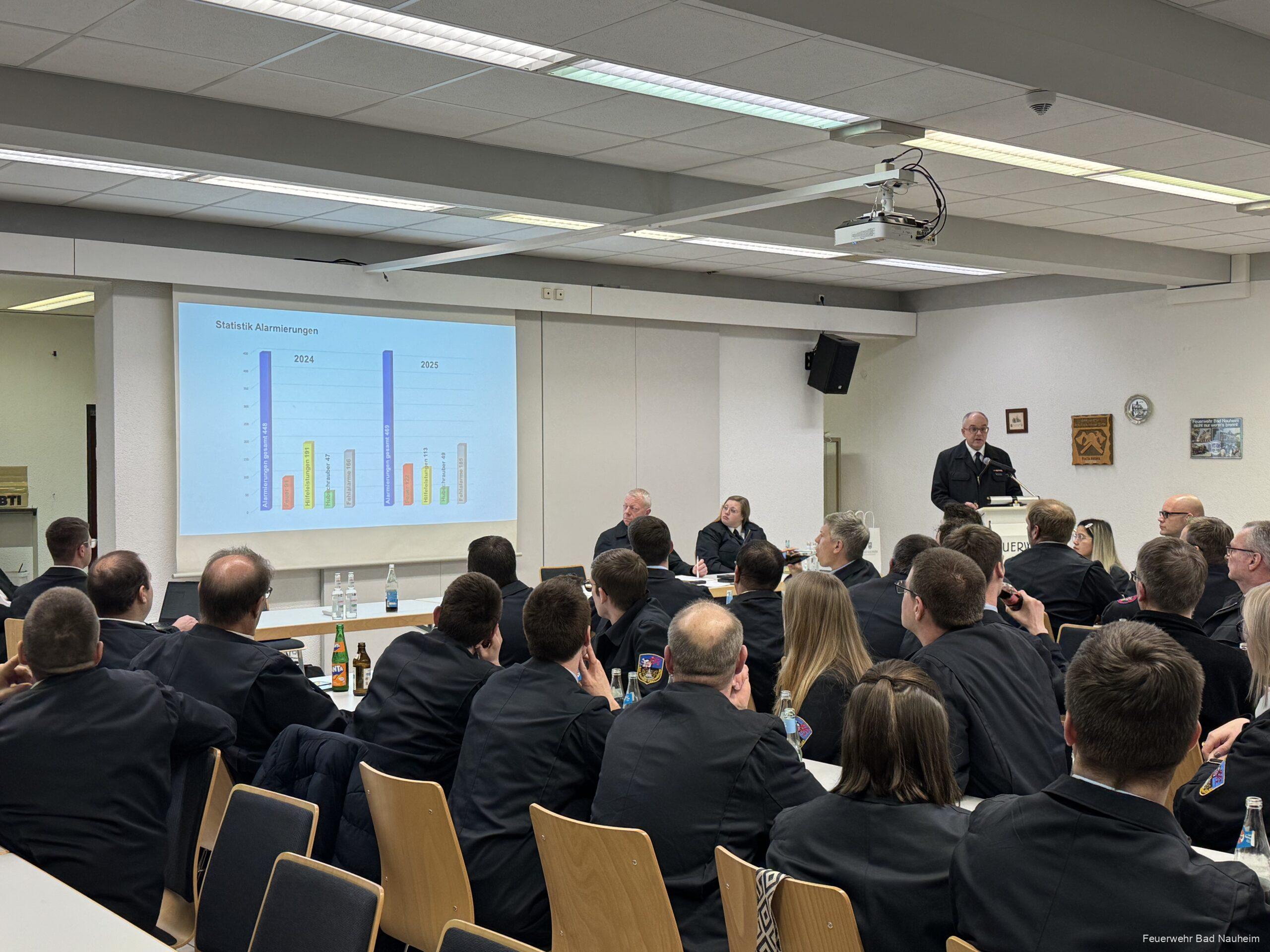Nach Genehmigung des Protokolls aus dem vergangenen Jahr und der traditionellen Totenehrung begann Dr. Christiansen mit dem Jahresbericht des Stadtbrandinspektors. Die Feuerwehr Bad Nauheim wurde im Jahr 2025 zu insgesamt 469 Einsätzen alarmiert (Feuer 122, Hilfeleistungen 113, Hubschrauberlandungen auf dem Stützpunkt 49 und Fehlalarme 185), was eine Steigerung um 21 Alarmierungen zum Vorjahr 2024 bedeutete. Beim Personal konnte ein erfreulicher Zuwachs von 7 Einsatzkräften auf insgesamt 158 verzeichnet werden.