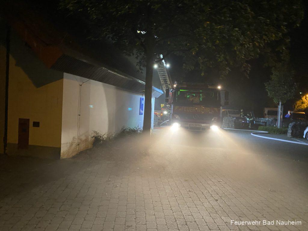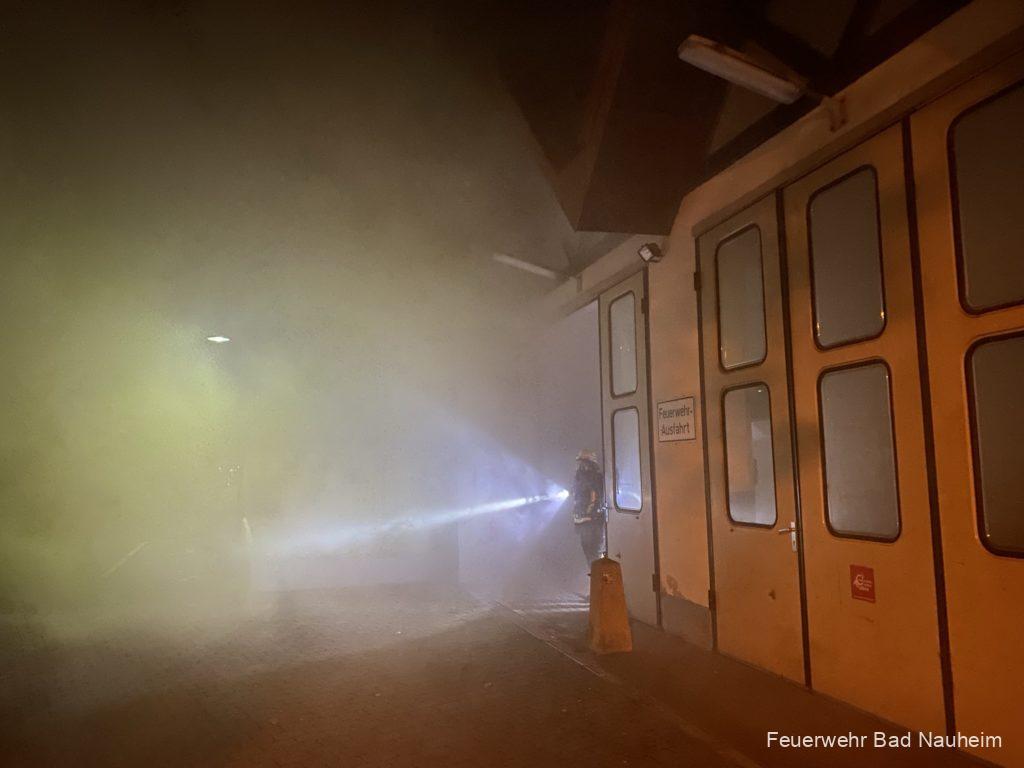 Zuerst wurde das Schwalheimer Löschfahrzeug abgerufen, das Einsatzstichwort lautete „Kleinbrand in Werkstatt“. Vor Ort wurde die Mannschaft bereits von einem aufgeregten Mitarbeiter in Empfang genommen, der von seinen beiden vermissten Kollegen und den nicht funktionierenden Hallentoren berichtete. Der Gruppenführer erhöhte daraufhin das Alarmstichwort und forderte die Kernstadt mit Einsatzleitwagen, Löschfahrzeug und Drehleiter nach. Gleichzeitig ging ein erster Trupp unter Atemschutz über den Hintereingang in die völlig verrauchte „Werkstatt“ vor und begann mit der Personensuche.