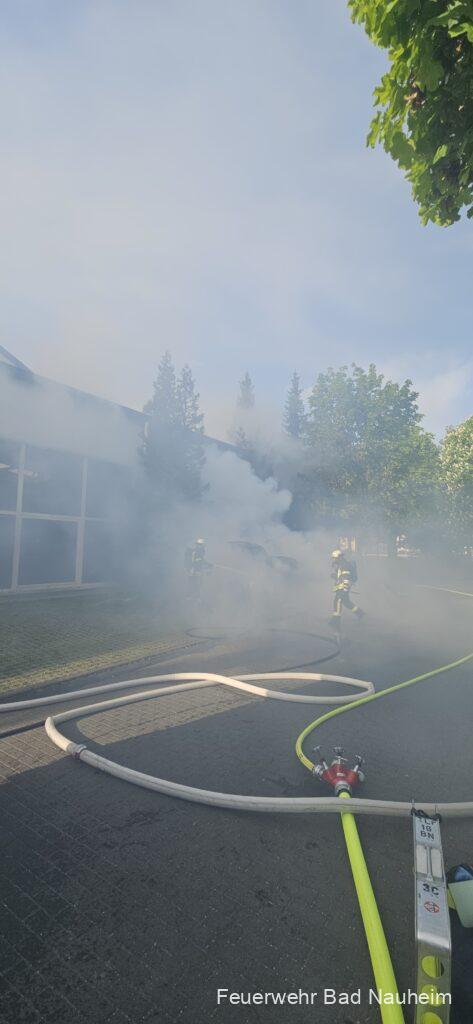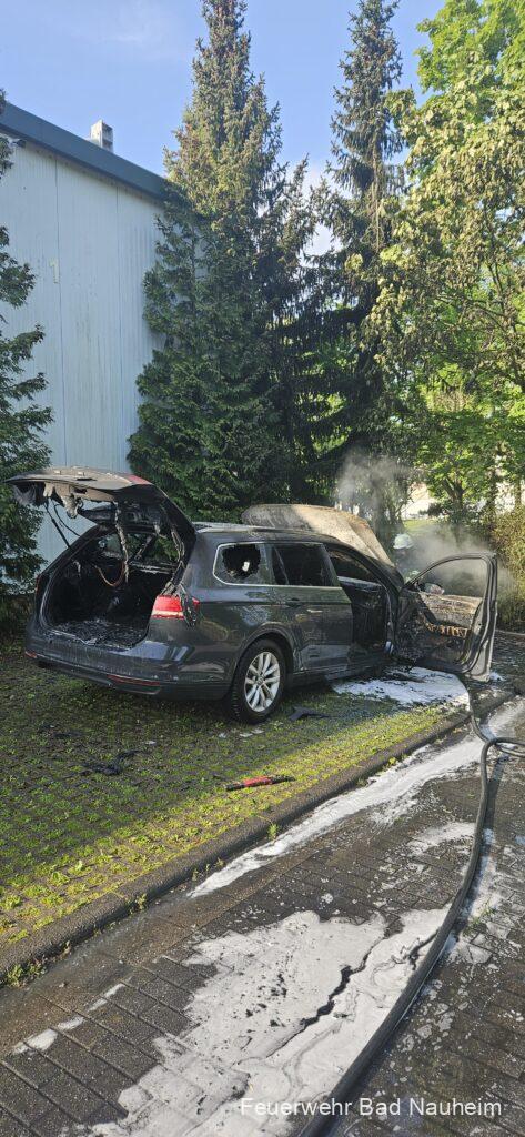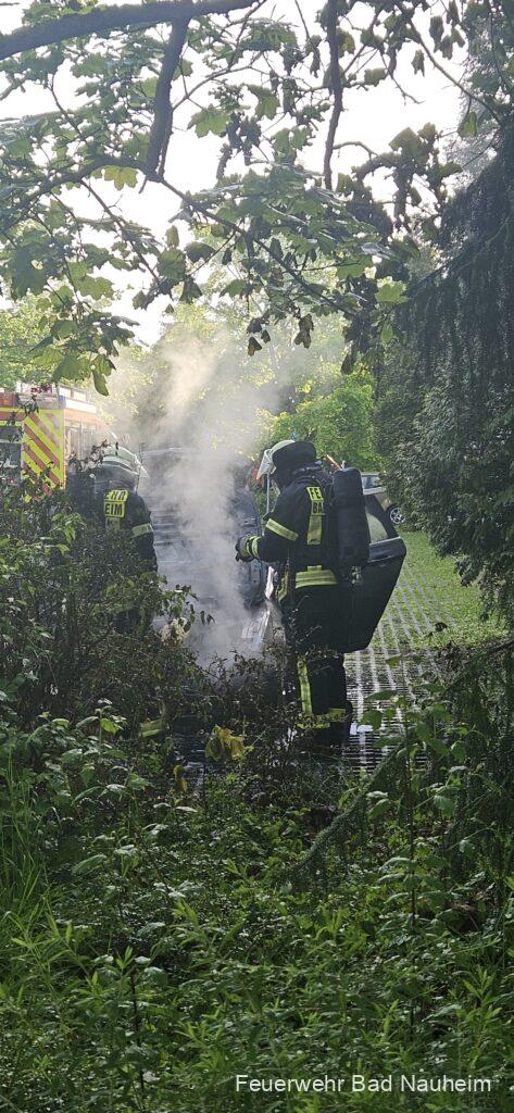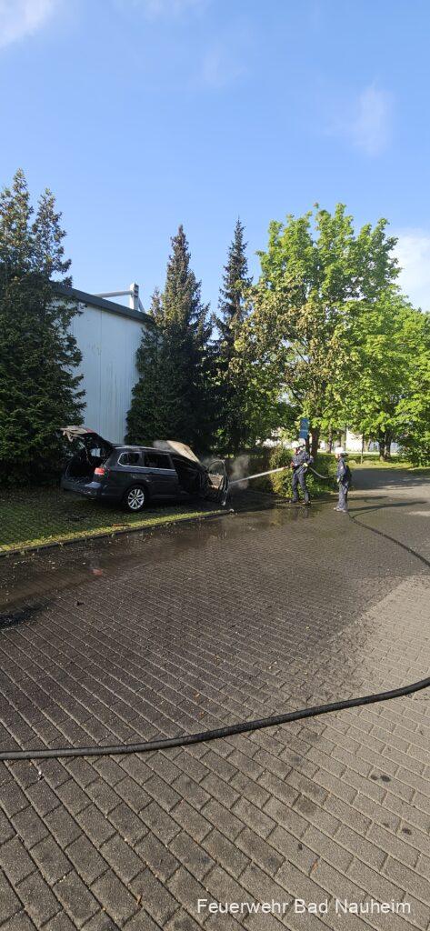 Gegen 08:00 Uhr wurden die Einsatzkräfte zu einem brennenden PKW in die Straße „In der Au“ alarmiert. Vor Ort brannte ein VW Kombi im Motor- und Fahrerraum. Die Familie aus den Niederlanden bemerkte eine Rauchentwicklung während der Fahrt und stellte das Fahrzeug auf dem Parkplatz der Tennishalle ab, dort schlugen dann bereits die Flammen aus der Motorhaube. Ein Trupp löschte den Brand unter Atemschutz ab, ein weiterer Trupp übernahm die Nachlöscharbeiten und säuberte die Umgebung von Brandgut. Der Einsatz war nach etwa 45 Minuten beendet.