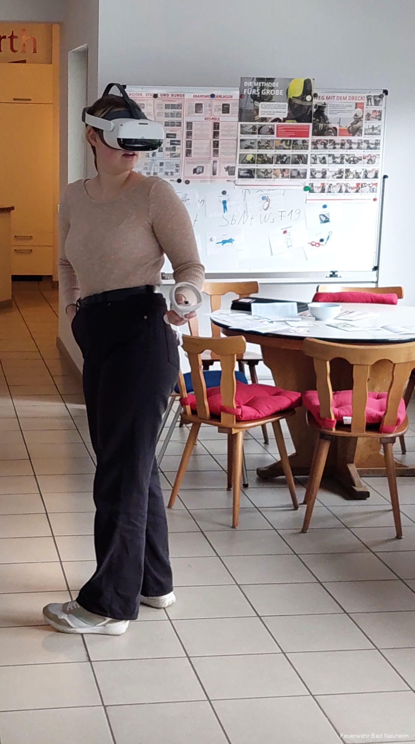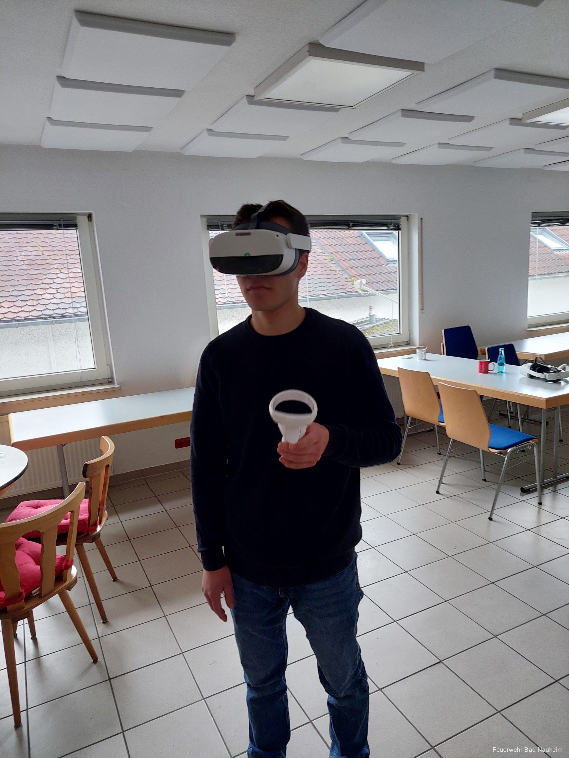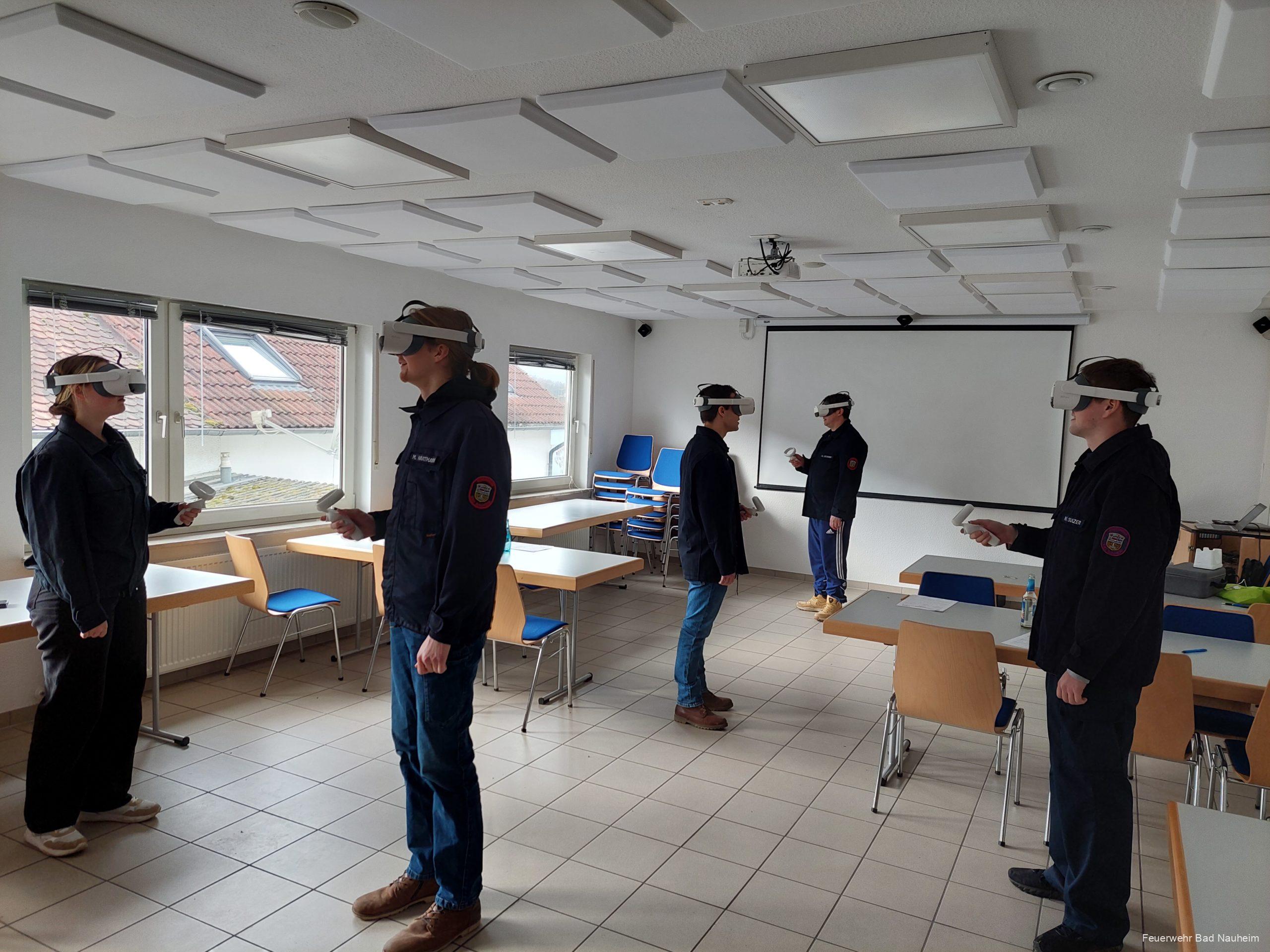Zur Erkundung der Lage wurde – wie in der Faschingszeit üblich – auf Masken gesetzt. Aber nicht irgendwelche Masken, nein: VR-Brillen, also Virtual-Reality Brillen wurden organisiert. Die Szenarien wurden von der hessischen Landesfeuerwehrschule zur Verfügung gestellt und waren bereits auf den VR-Brillen aufgespielt.