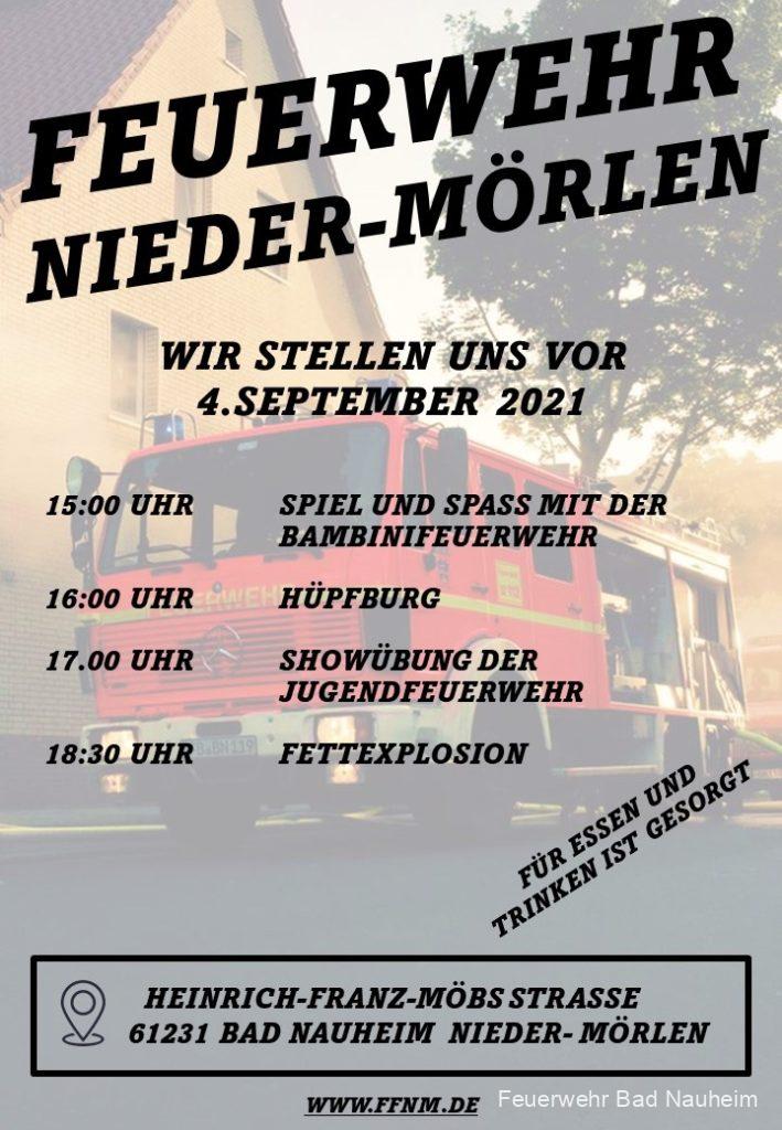 Los geht es um 15 Uhr in der Heinrich-Franz-Möbs-Straße mit einer Vorführung der Bambinifeuerwehr. Ab 16 Uhr gibt es Spaß für die Kleinen in der Hüpfburg. Ein weiteres Highlight ist eine Vorführung der Jugendfeuerwehr um 17 Uhr. Zum Abschluss hat sich die Freiwillige Feuerwehr Nieder-Mörlen etwas besonderes überlegt: Punkt 18.30 Uhr wird es eine Fettexplosion mit anschließender Löschung geben. Für Speis und Trank ist gesorgt. Es gelten die bekannten Corona-Maßnahmen. Eine vorherige Registrierung ist nicht notwendig.